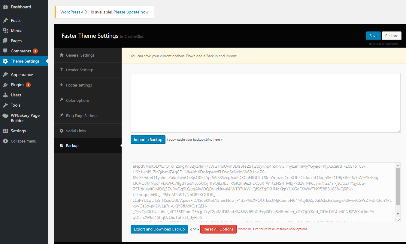 • Now you have to import the Dental Options as like the demo. Navigate to ‘Theme Settings > Backup’. Then copy-paste the backup string here and click on the Import a Backup button. You will find the backup string in the options.txt file.